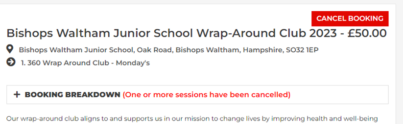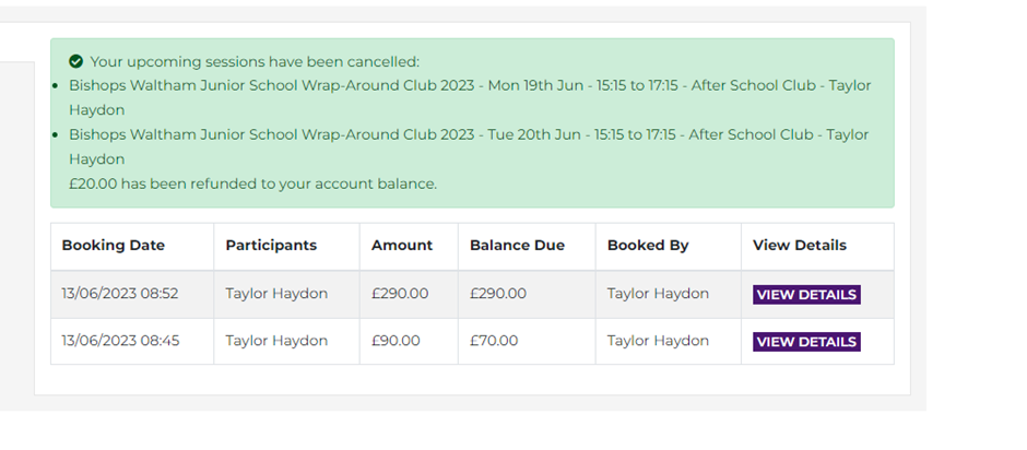You will then get a confirmation screen showing which sessions you cancelled, and a follow up email to confirm the change in your booking. Your account balance will be credited automatically.
