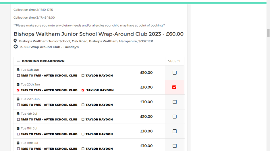 You will then be shown the individual sessions you have booked, and you can select the ones you want to cancel: