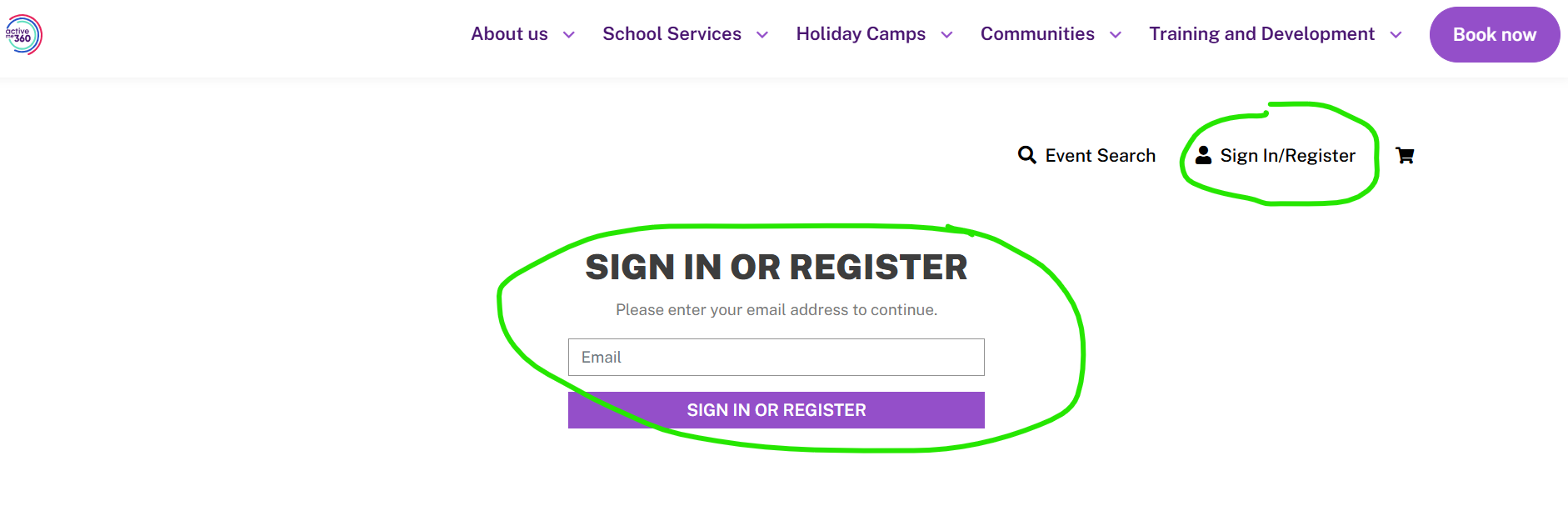 If you have an account with us already, great! Please select the sessions you'd like to book on for and proceed to checkout. If you don't, then you'll need to create an account by clicking the Sign in/Register button: